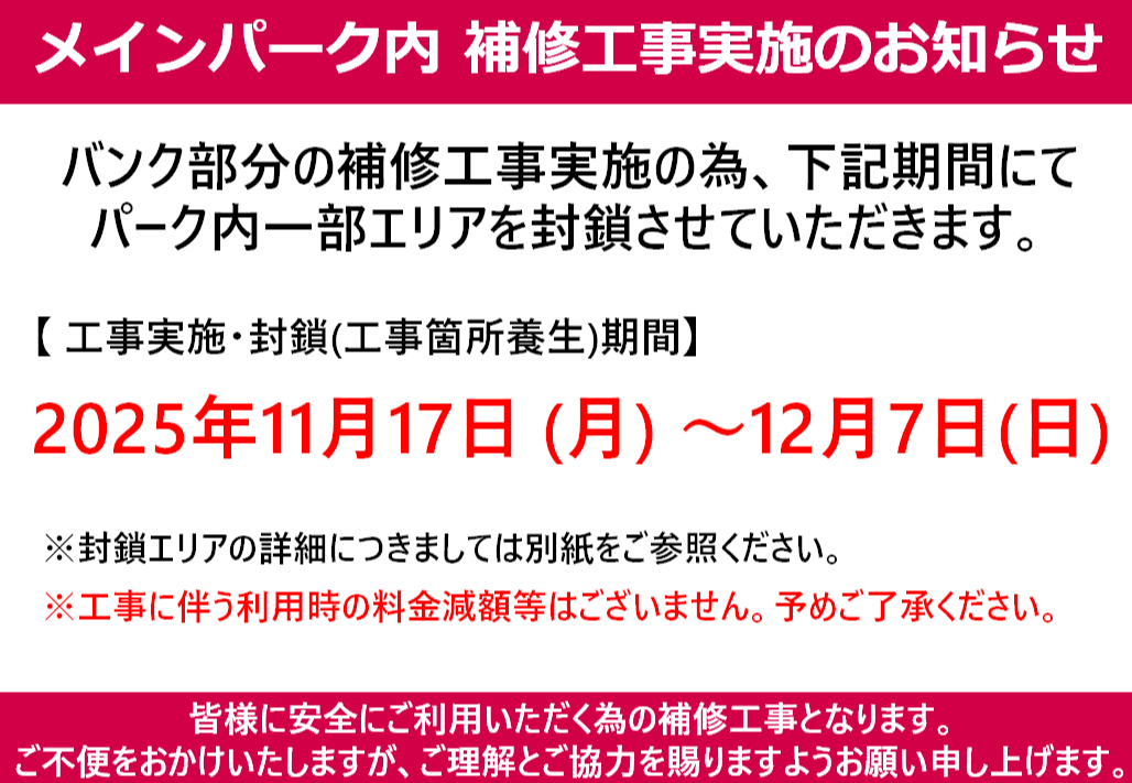【重要】11月~12月メインパーク補修工事実施のお知らせ